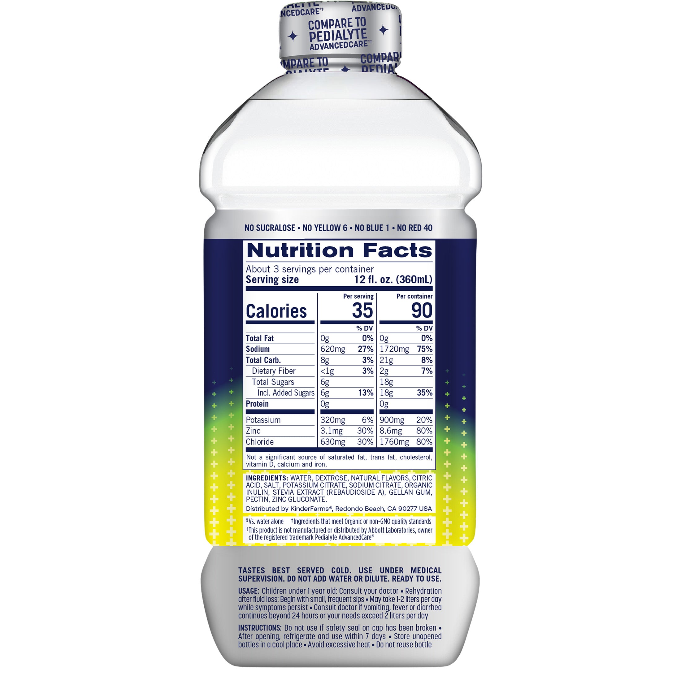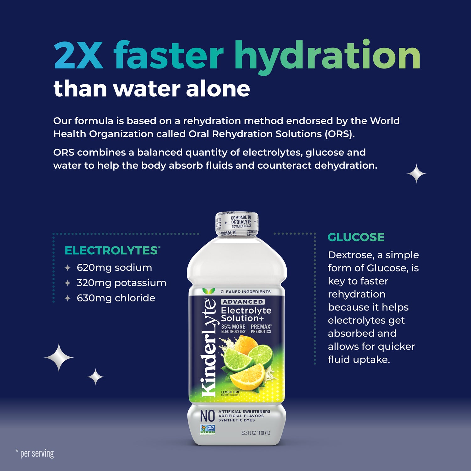 - FAST HYDRATION - With PreMax prebiotics, KinderLyte Advanced electrolyte solution works 2 times faster than water alone, thanks to a mix of electrolytes (including potassium and chloride) and glucose; contains 35% more electrolyte sodium than our original formula and 70% less sugar than the leading sports drink
