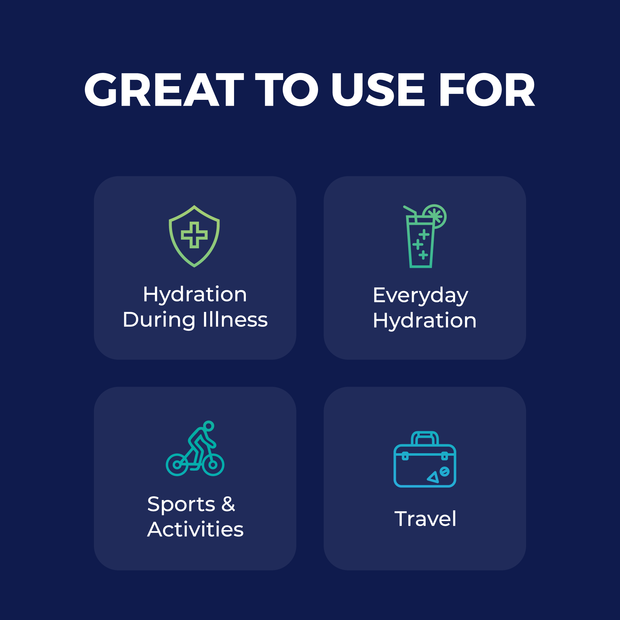- CONVENIENT - Enjoy a glass of Advanced Electrolyte Solution any time, to combat dehydration caused by illness, heat exhaustion, travel, sports or physical activity; works great for adults and kids aged 1+