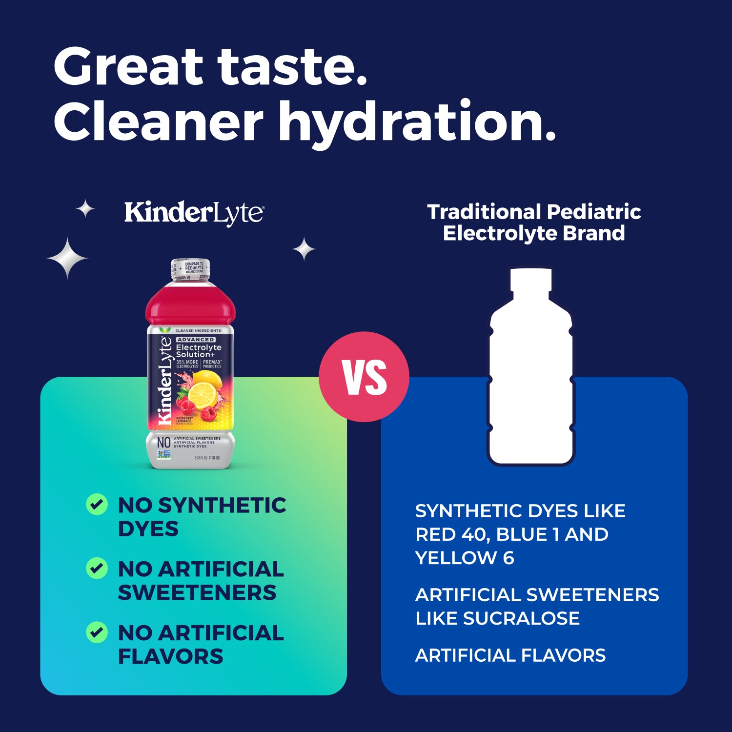 - FAST HYDRATION - With PreMax prebiotics, KinderLyte Advanced electrolyte solution works 2 times faster than water alone, thanks to a mix of electrolytes (including potassium and chloride) and glucose; contains 35% more electrolyte sodium than our original formula and 70% less sugar than the leading sports drink