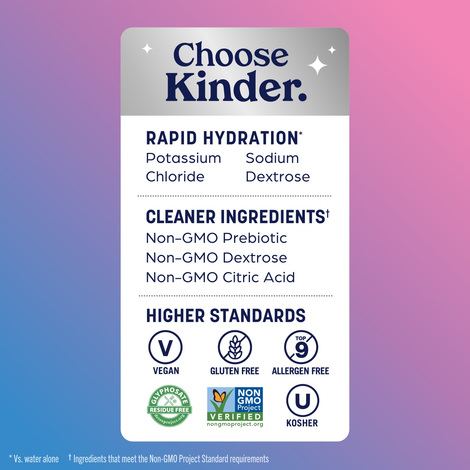 - CLEANER INGREDIENTS - Great-tasting KinderLyte provides the hydration and immunity support you need with no synthetic dyes, no artificial sweeteners, and no artificial flavoring; made with ingredients that meet the Non-GMO Project standard requirements
